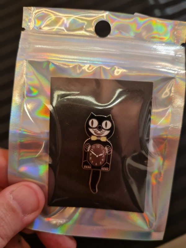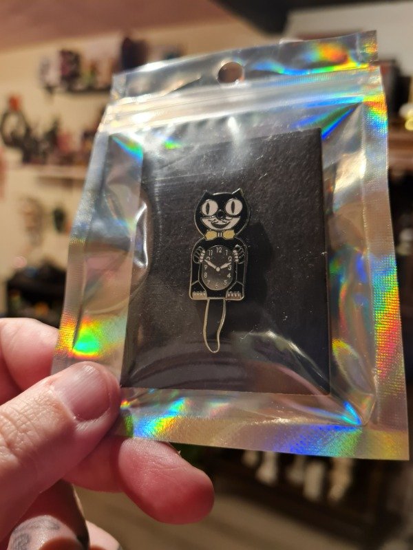 Pin metalico esmaltado de gatito reloj vintage, inspirado en el clásico Kit-Cat Clock. Un accesorio original y retro para darle un toque divertido a tu outfit o colección.